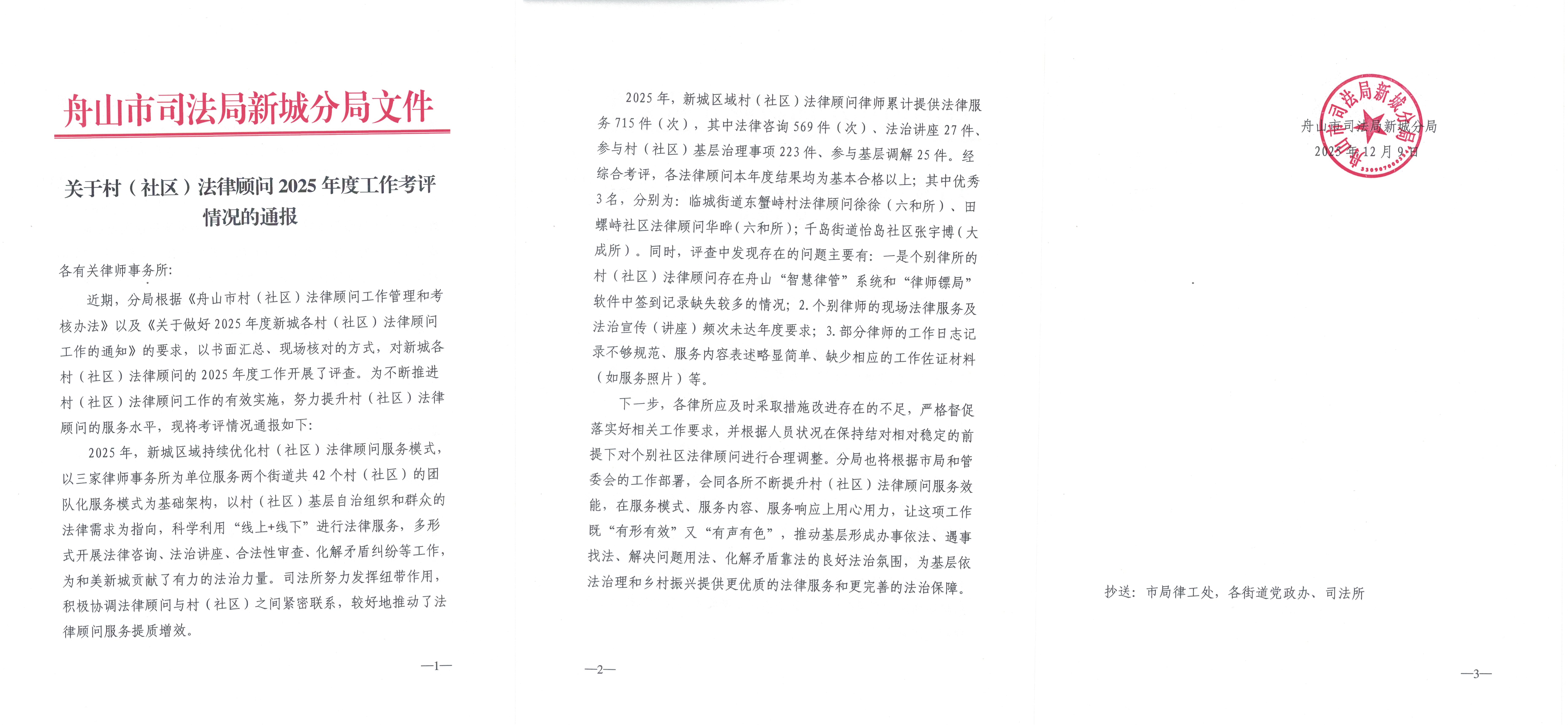 近日,舟山市司法局新城分局发布2025年度村(社区)法律顾问工作考评通报,六和(舟山)律师事务所徐徐、华晔两名律师凭借扎实的服务成效与专业的履职表现,双双获评优秀等次。